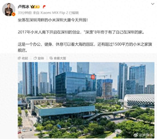 7月18日上午消息,小米集團合伙人兼總裁、手機部總裁盧偉冰于微博宣布,“坐落在深圳灣畔的小米深圳大廈今天開園,2017年小米人南下開啟在深圳的創業,深漂8年終于有了自己在深圳的家。”