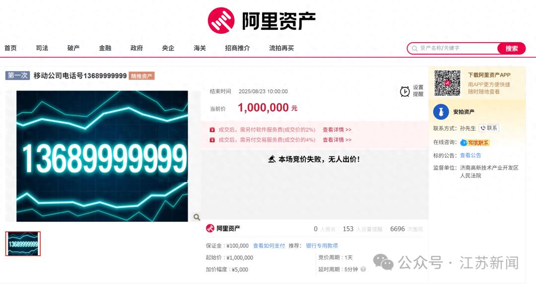 日前,在阿里資產拍賣上,尾號“9999999”的手機號以100萬元的底價掛網進行拍賣。8月23日,在24小時的競價周期里,因為無人出價導致流拍。此前,有一個尾號“9999999”的手機號被拍出44.55萬元。