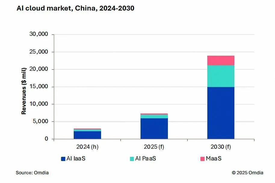 Omdia預測,2025年到2030年,中國AI云市場復合年增長率(CAGR)將達到26.8%,未來AI云的增長將由多Agents合作、上下文工程、AI安全、大規模API調用等驅動。其中MaaS層(AI模型服務)預計增長最快,復合年增長率將超72%,2030年將達177億元規模。
