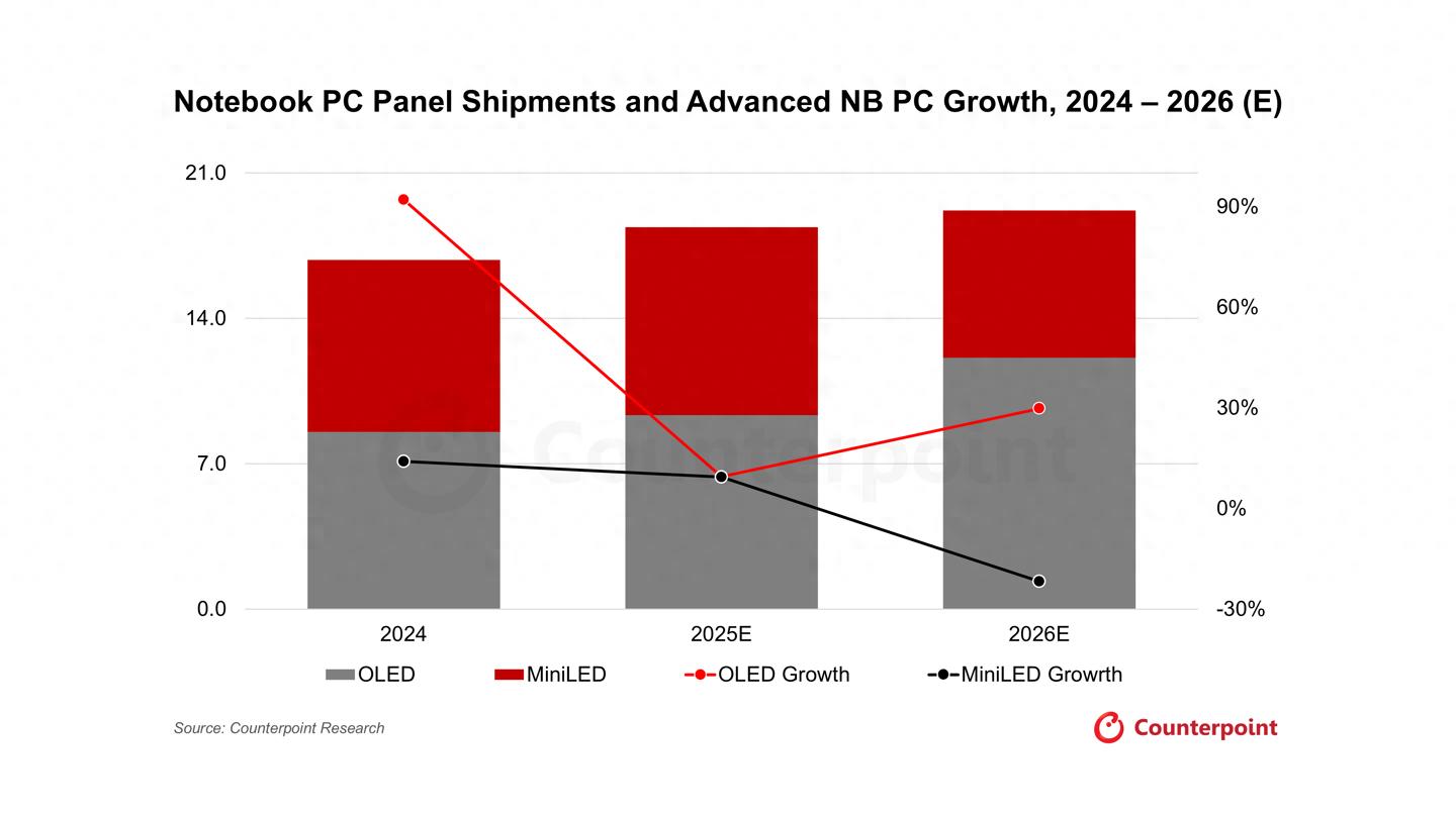 細(xì)分到面板方面,包括 OLED 和 Mini LED 技術(shù)的先進(jìn)筆記本電腦面板預(yù)計(jì)將同比增長(zhǎng) 9%,占 2025 年筆記本電腦總出貨量的 8%。