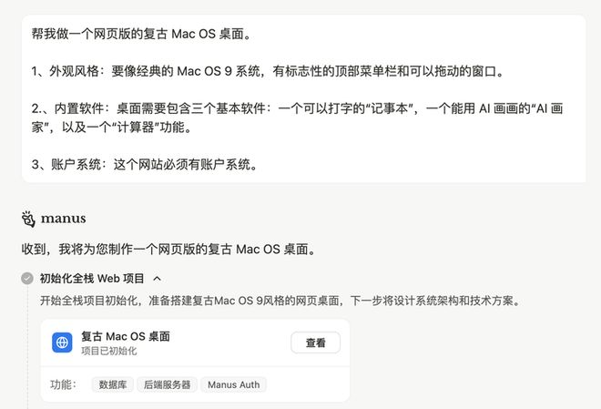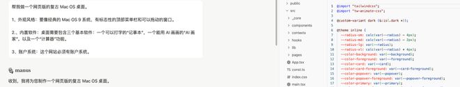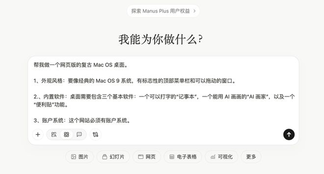 作為一個曾經(jīng)測試過多款AI Coding工具的用戶,我對“AI 生成網(wǎng)站”這類功能早已不陌生。當我看到據(jù)傳是有人用Gemini 3.0復刻macOS的演示后,我決定用Manus 1.5來試試,看它能做到什么程度?