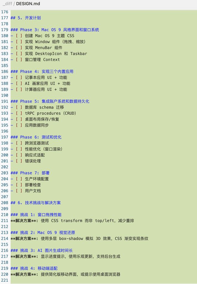 接著Manus開始設計系統(tǒng)架構和技術方案,并且創(chuàng)建了一個DESING文件。從技術棧、數(shù)據(jù)庫表,到UI細節(jié),甚至可能的技術挑戰(zhàn)都提前想好并給出了解決方案。