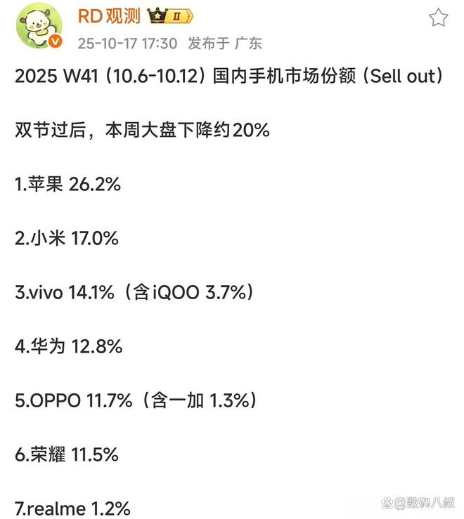 第41周國(guó)內(nèi)市場(chǎng)手機(jī)銷量排名出爐,國(guó)產(chǎn)旗艦干掉蘋果旗艦任重而道遠(yuǎn),沒創(chuàng)新的iPhone 17系列有贏了。