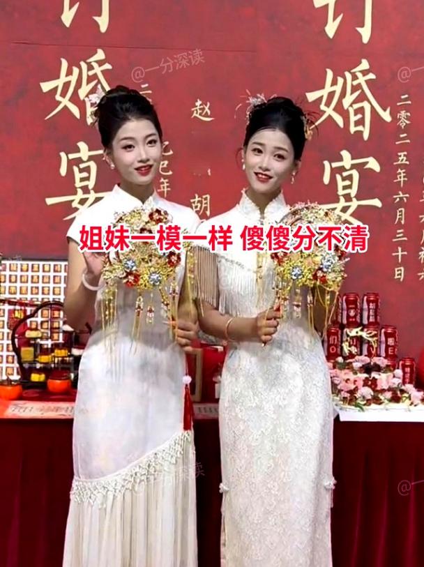 大中午頭兒,兩對(duì)新人往門框前一杵,直接把院里的大姨們整懵了——穿白褂子的新郎和套黑西裝的兄弟活脫脫一個(gè)模子刻的,倆新娘更絕,盤著同樣的發(fā)髻,連旗袍開衩的高度都分毫不差。